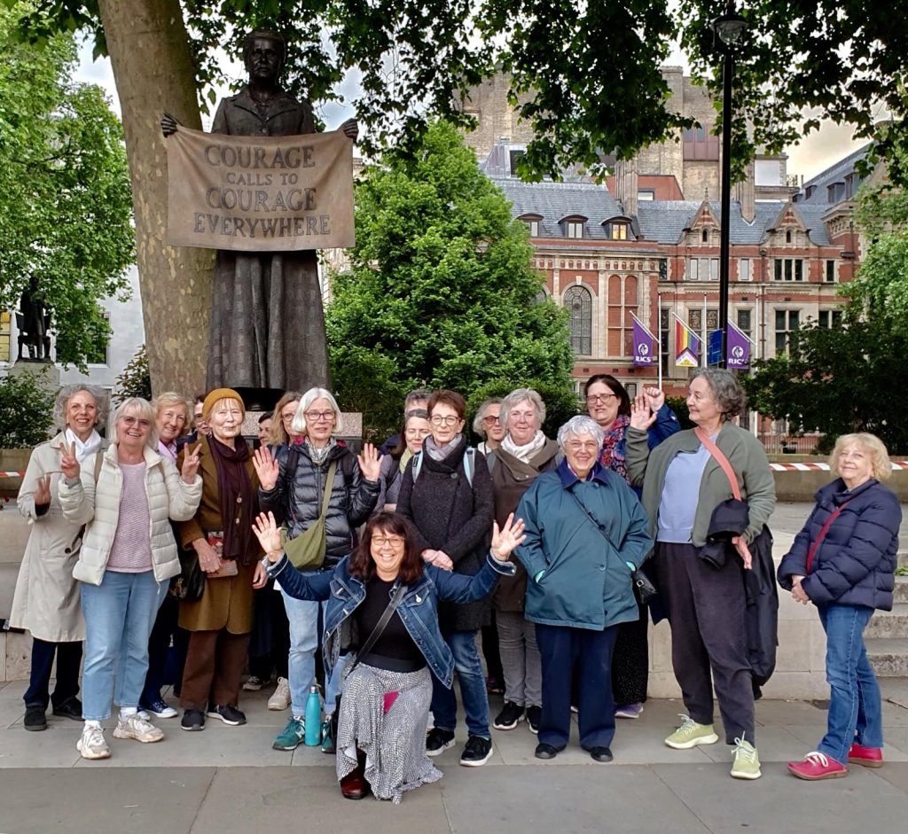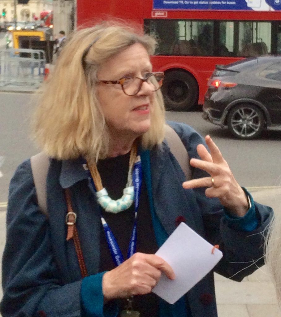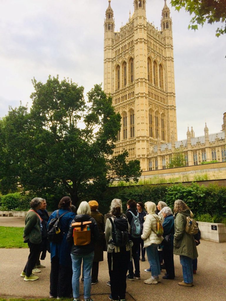 When we were organising our guided walk we had no idea that the subject would be so timely and that we would be exploring Westminster in the middle of a general election campaign! Our wonderful guide, Hazel Phillips, met us in Victoria Tower Gardens and took us on a tour, ‘Westminster – in the eye of political change‘, which chronicled the history of suffrage in the UK. We were reminded of the many struggles over the centuries over the right to vote and that in particular, all women only got the vote less than 100 years ago after many years of campaigning. So we all resolved that it was important to use our vote in the coming election. Despite threats of rain, the evening sun shone and reminded us how beautiful London can be! Thank you Hazel for a lovely evening.
